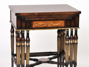 Nesting table with hand cut merquetry veneer in top